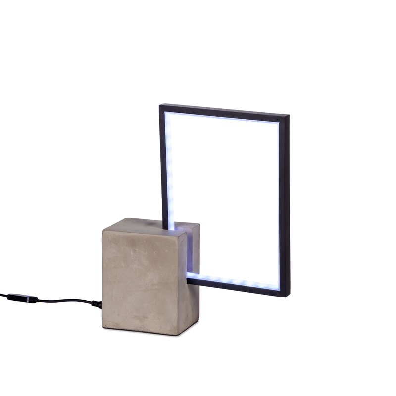 Striking in its simplicity, this stripped-down table lamp pairs well with existing decor to accentuate any ensemble. Founded atop a small square concrete base, this design’s exposed lighting draws attention to the frame of this table lamp. Modern rectangle shapes electric table lamp with a concrete base. Black with warm white LED. 52" Lead cord with on and off switch.